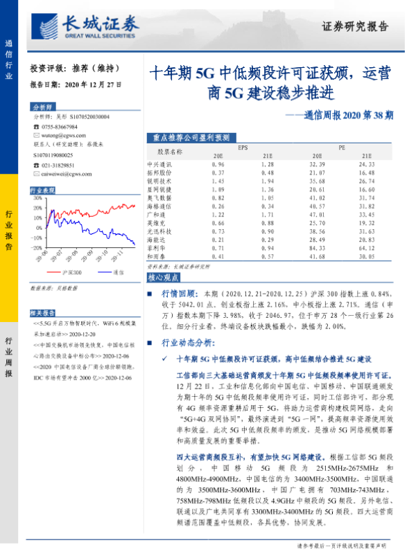 【长城证券】【20201227】20201227-长城证券-通信周报2020第38期:十年期5G中低频段许可证获颁,运营商5G建设稳步推进-12页
