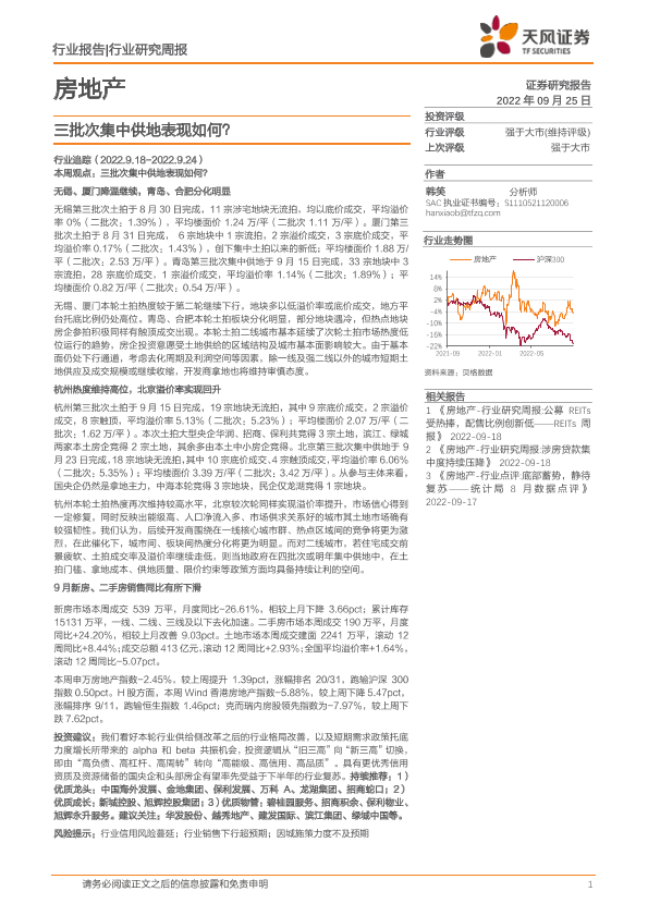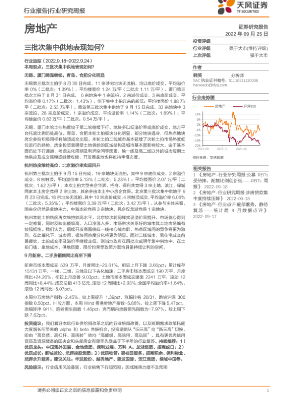 【天风证券】【20220925】房地产行业研究周报:三批次集中供地表现如何?-21页