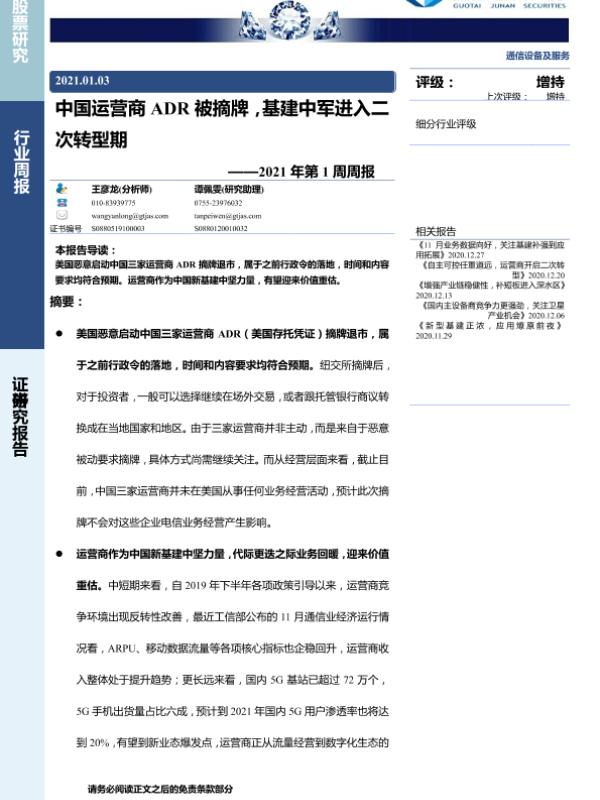 【国泰君安证券】【20210103】中国运营商ADR被摘牌,基建中军进入二次转型期-24页