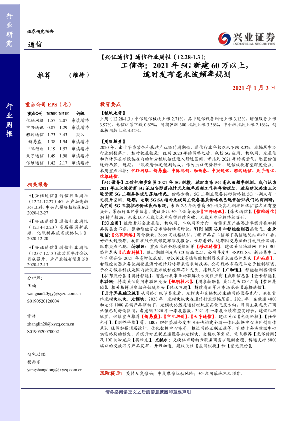 【兴业证券】【20210103】通信行业周报:工信部:2021年5G新建60万以上,适时发布毫米波频率规划-8页