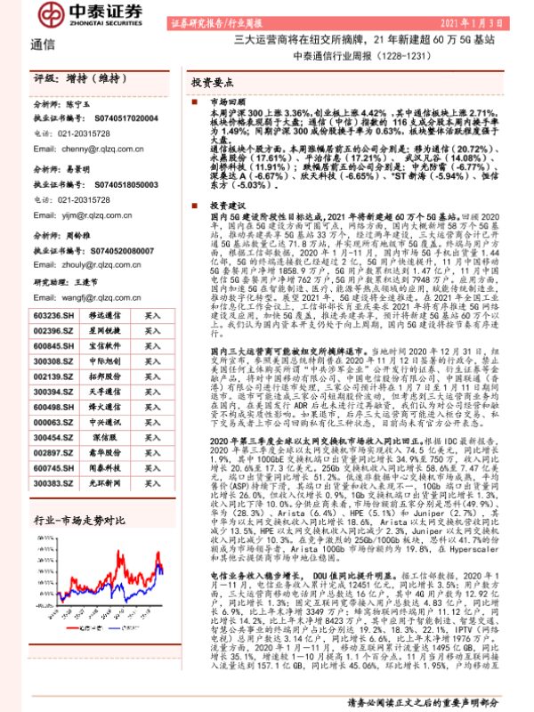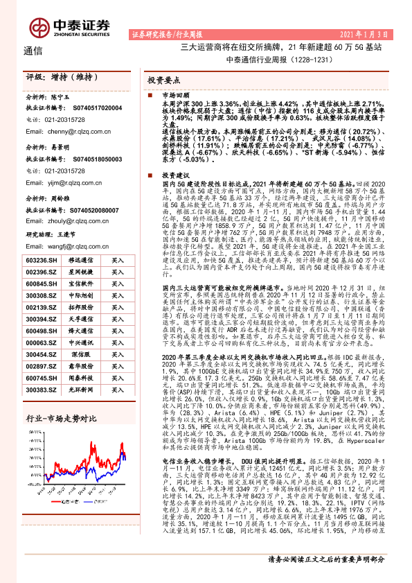 【中泰证券】【20210103】通信行业周报:三大运营商将在纽交所摘牌,21年新建超60万5G基站-14页