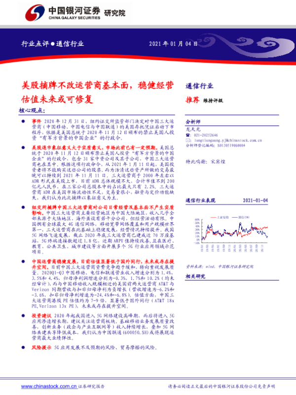 【银河证券】【20210104】通信行业:美股摘牌不改运营商基本面,稳健经营估值未来或可修复-2页