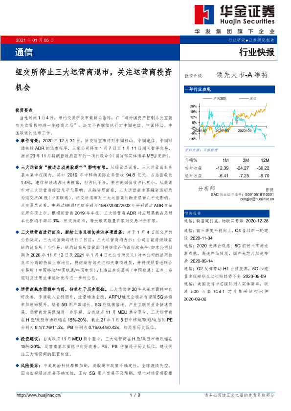 【华金证券】【20210105】通信行业:纽交所停止三大运营商退市,关注运营商投资机会-9页