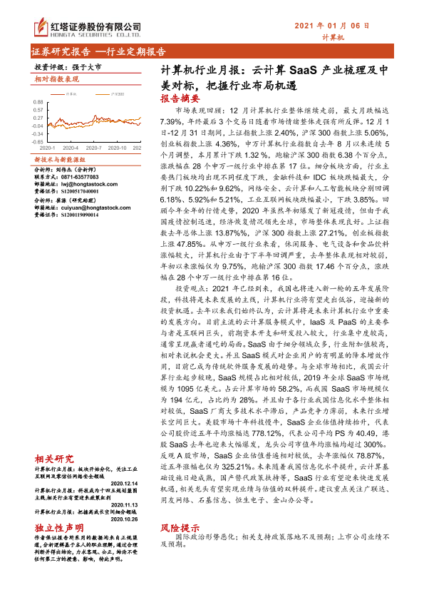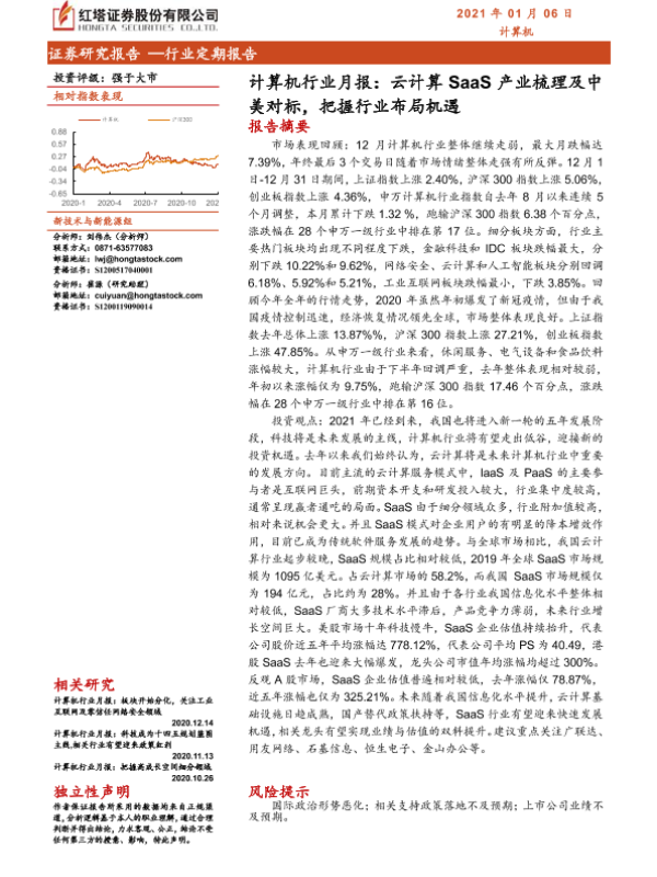 【红塔证券】【20210106】计算机行业月报:云计算SaaS产业梳理及中美对标,把握行业布局机遇-13页
