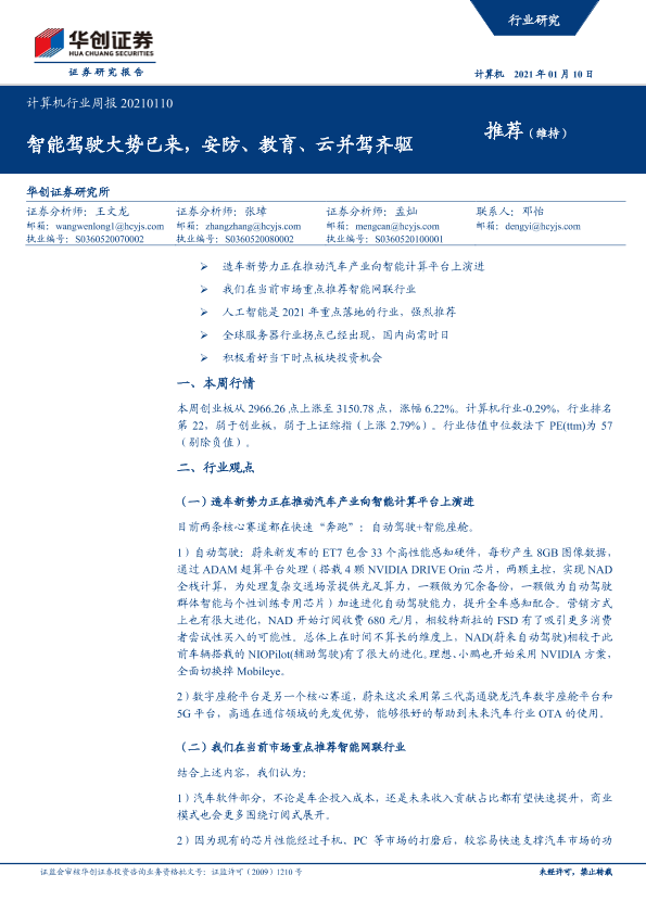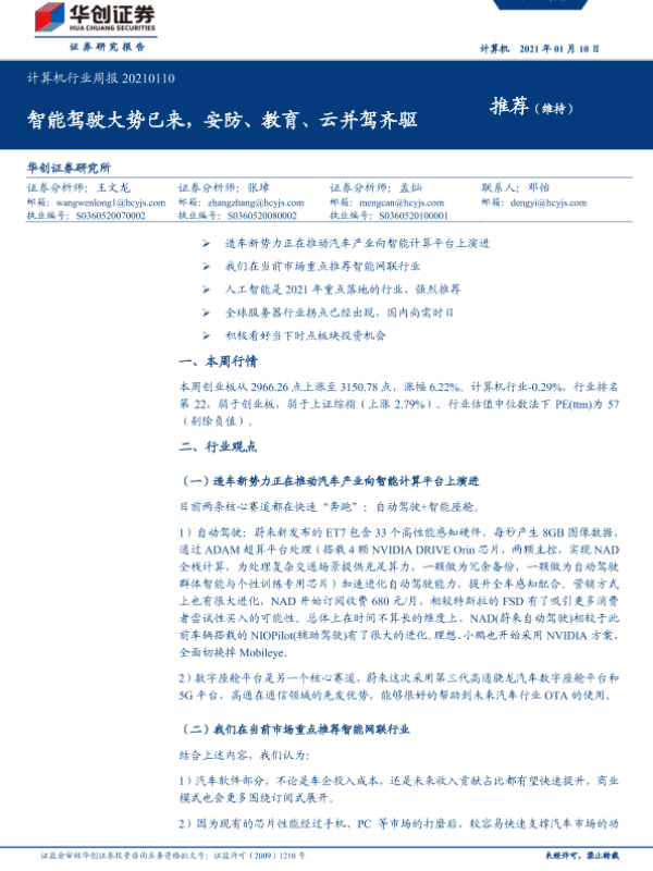 【华创证券】【20210110】计算机行业周报:智能驾驶大势已来,安防、教育、云并驾齐驱-5页