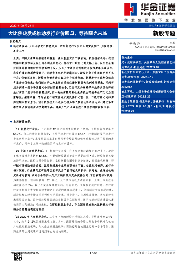 【华金证券】【20220915】新股专题:大比例破发或推动发行定价回归,等待曙光来临-20页