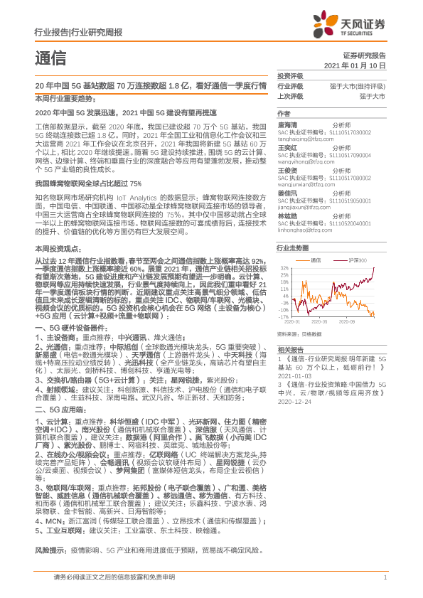 【天风证券】【20210110】20210110-天风证券-通信行业研究周报:20年中国5G基站数超70万连接数超1.8亿,看好通信一季度行情-15页
