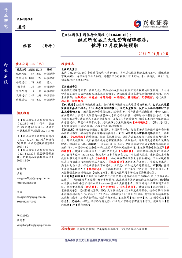 【兴业证券】【20210110】【兴证通信】通信行业周报(01.04-01.10):纽交所重启三大运营商摘牌程序,信骅12月数据超预期-9页