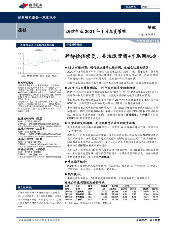 【国信证券】【20210112】通信行业2021年1月投资策略:静待估值修复,关注运营商+车联网机会-15页