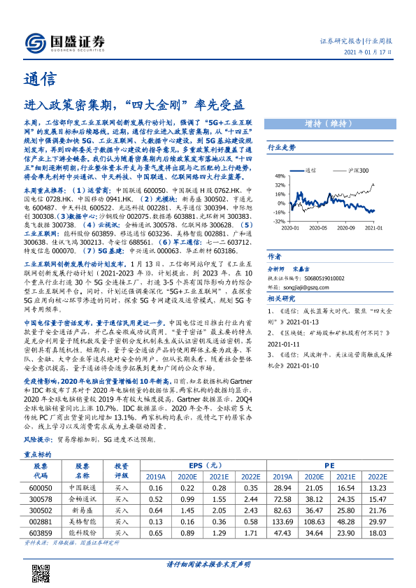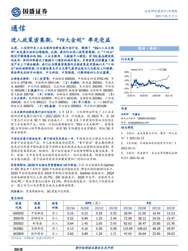 【国盛证券】【20210117】通信行业周报:进入政策密集期,“四大金刚”率先受益-13页