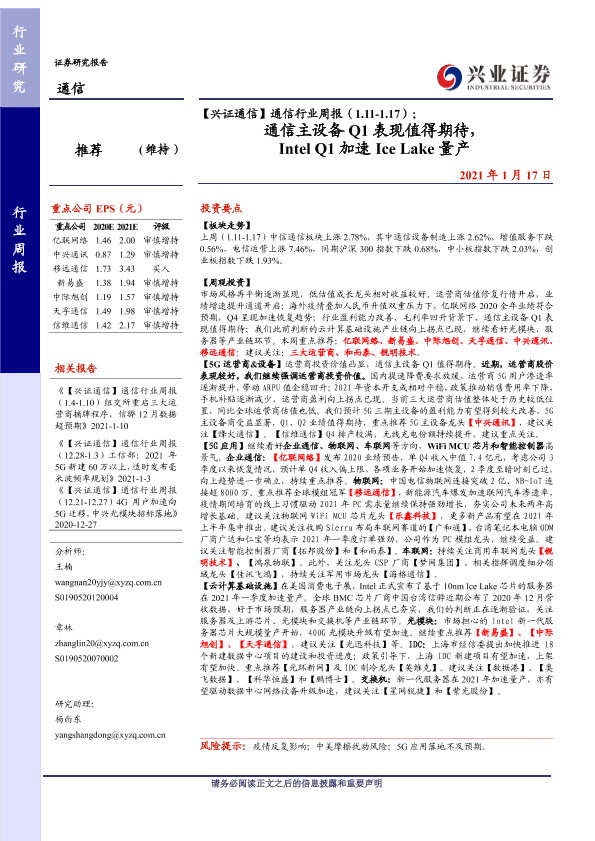 【兴业证券】【20210117】通信行业周报(1.11-1.17):通信主设备Q1表现值得期待,Intel Q1加速Ice Lake量产-9页
