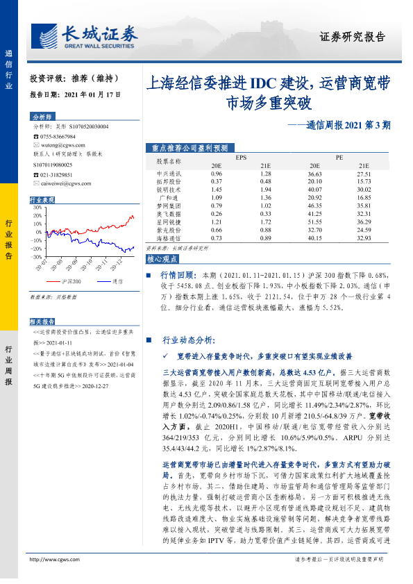 【长城证券】【20210117】20210117-长城证券-通信周报2021第3期:上海经信委推进IDC建设,运营商宽带市场多重突破-15页
