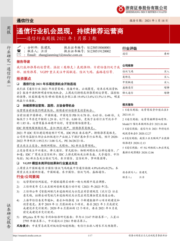 【浙商证券】【20210118】通信行业周报2021年1月第3期:通信行业机会显现,持续推荐运营商-17页