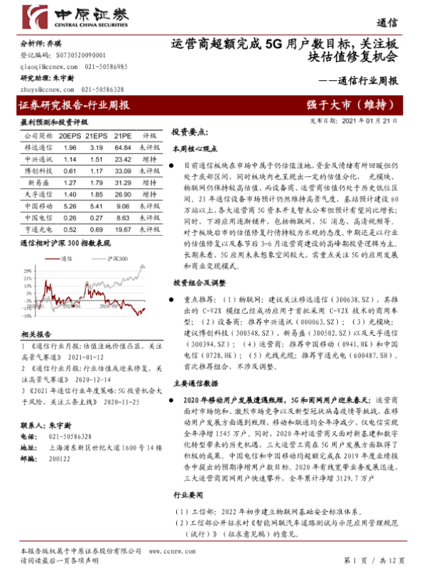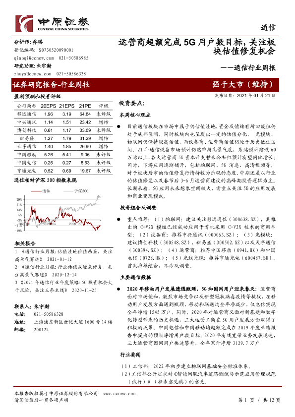 【中原证券】【20210121】20210121-中原证券-通信行业周报:运营商超额完成5G用户数目标,关注板块估值修复机会-12页