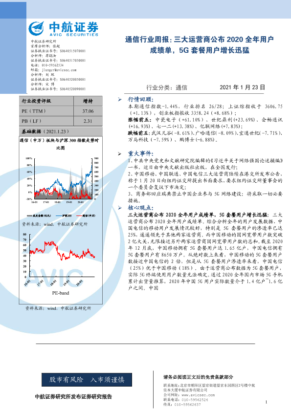 【中航证券】【20210123】通信行业周报:三大运营商公布2020全年用户成绩单,5G套餐用户增长迅猛-3页