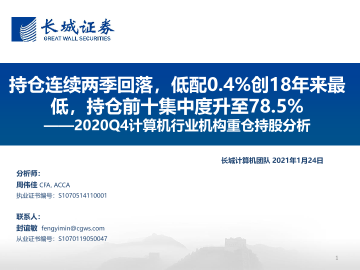 【长城证券】【20210124】2020Q4计算机行业机构重仓持股分析:持仓连续两季回落,低配0.4%创18年来最低,持仓前十集中度升至78.5%-13页
