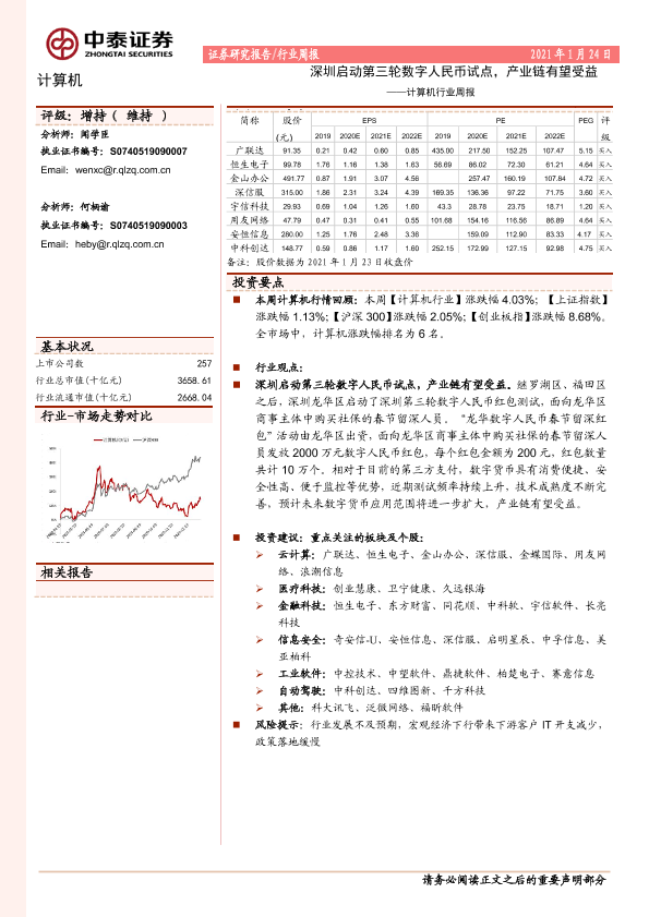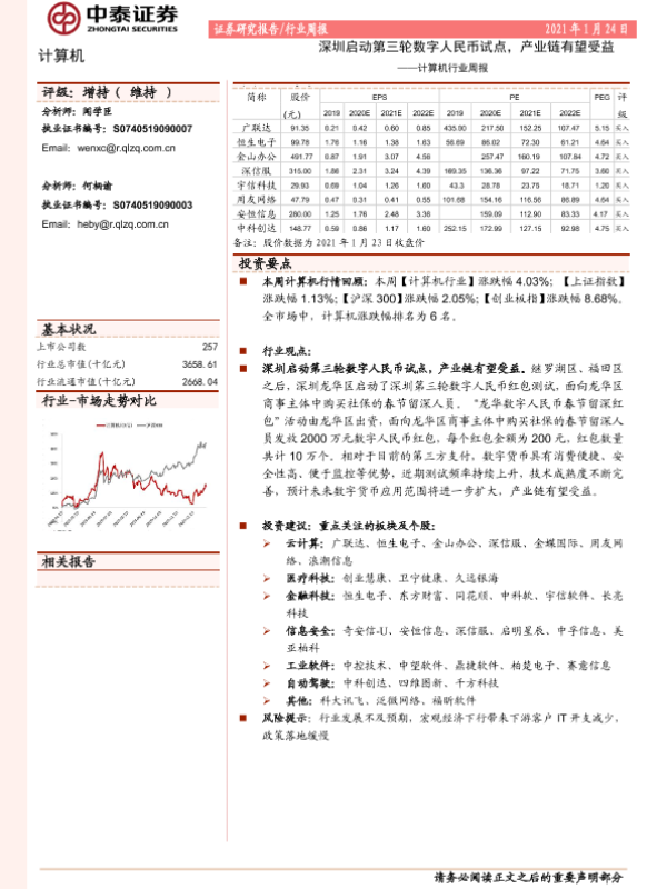 【中泰证券】【20210124】20210124-中泰证券-计算机行业周报:深圳启动第三轮数字人民币试点,产业链有望受益-8页