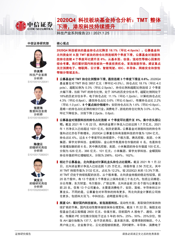 【中信证券】【20210125】2020Q4科技板块基金持仓分析:TMT整体下滑,港股科技持续提升-19页