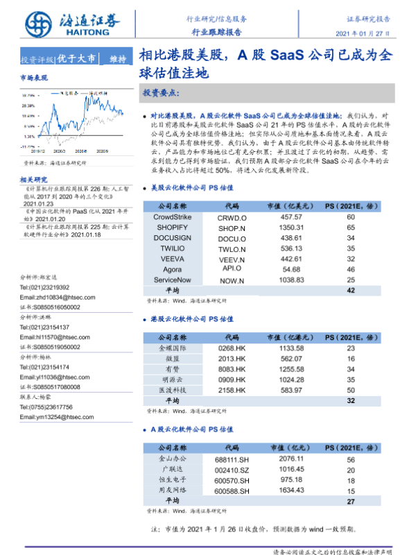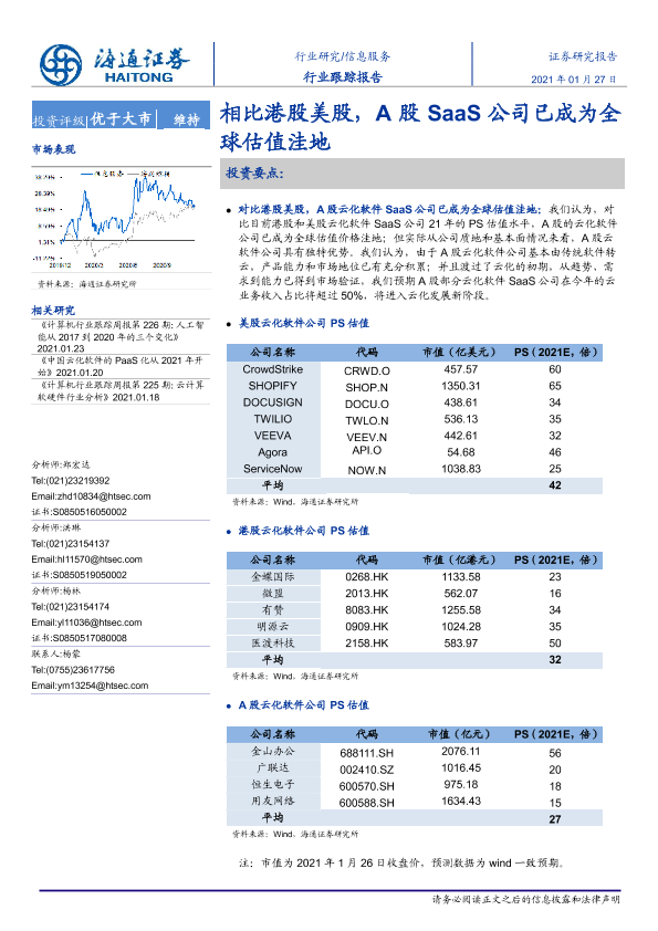 【海通证券】【20210127】相比港股美股,A股SaaS公司已成为全球估值洼地-3页