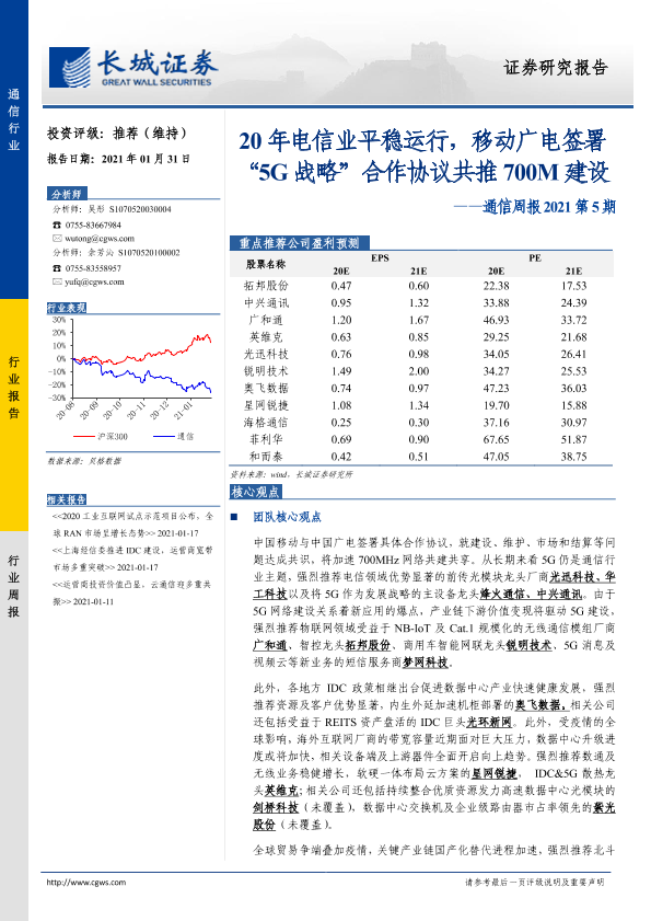 【长城证券】【20210131】通信周报2021第5期:20年电信业平稳运行,移动广电签署“5G战略”合作协议共推700M建设-16页