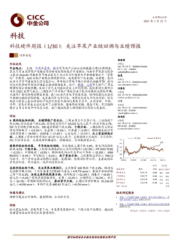 【中金公司】【20210131】科技硬件周报(1 30):关注苹果产业链回调与业绩预报-13页