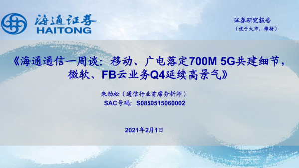 【海通证券】【20210201】海通通信一周谈:移动、广电落定700M 5G共建细节,微软、FB云业务Q4延续高景气-10页