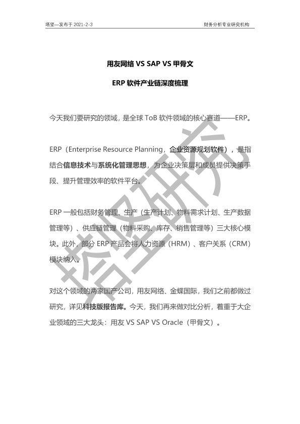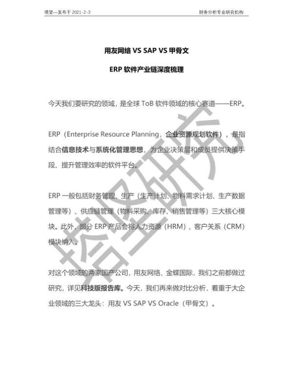 【塔坚】【20210203】20210203-并购优塾-ERP软件产业链深度梳理:用友网络VS SAP VS甲骨文-18页