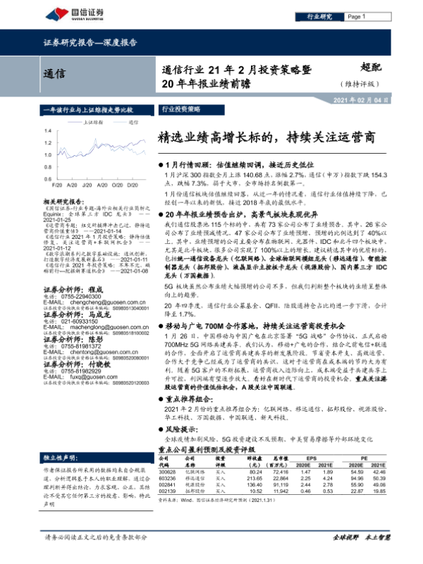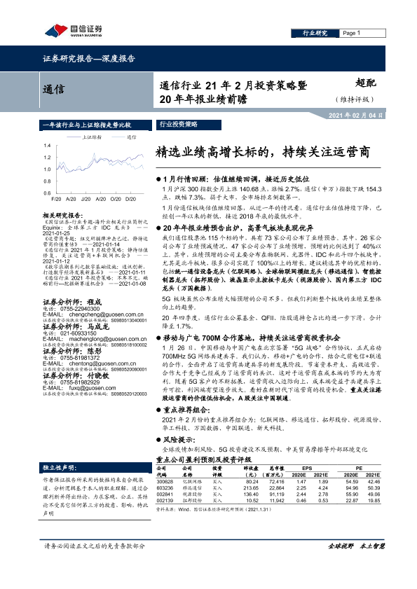 【国信证券】【20210204】通信行业21年2月投资策略暨20年年报业绩前瞻:精选业绩高增长标的,持续关注运营商-16页