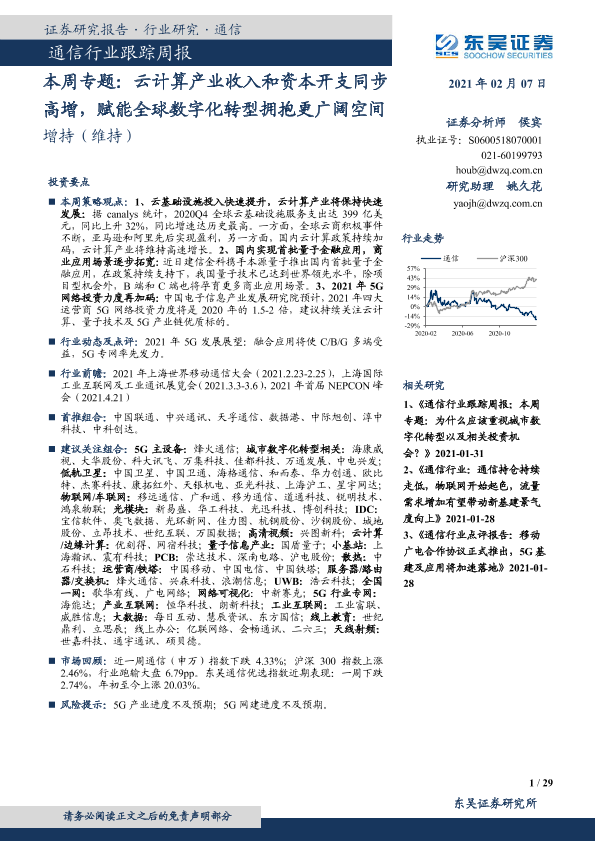 【东吴证券】【20210207】20210207-东吴证券-通信行业跟踪周报:本周专题:云计算产业收入和资本开支同步高增,赋能全球数字化转型拥抱更广阔空间-29页