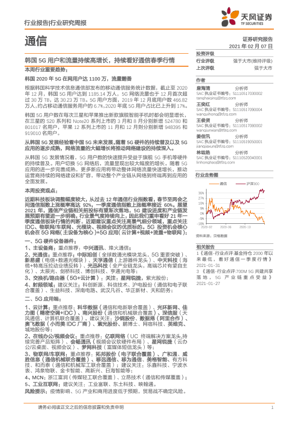 【天风证券】【20210207】通信行业研究周报:韩国5G用户和流量持续高增长,持续看好通信春季行情-13页