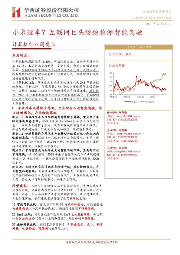 【华西证券】【20210220】20210220-华西证券-计算机行业周观点:小米造车?互联网巨头纷纷抢滩智能驾驶-20页