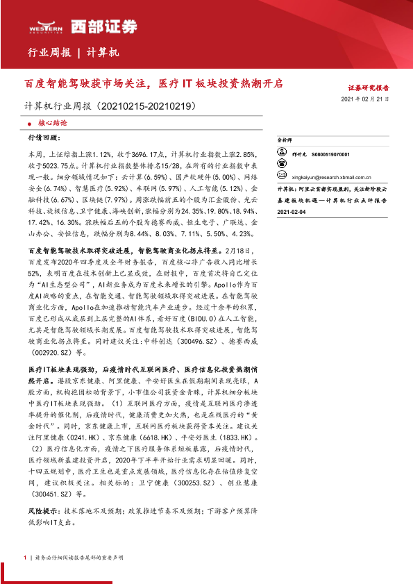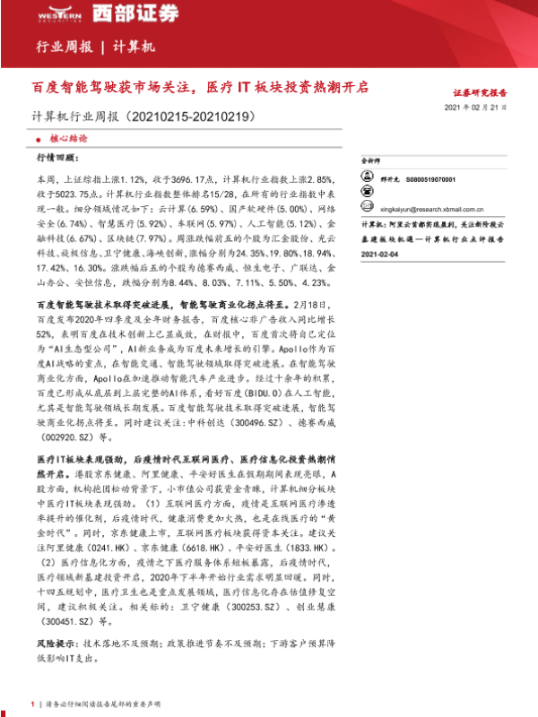 【西部证券】【20210221】计算机行业周报:百度智能驾驶获市场关注,医疗IT板块投资热潮开启-16页