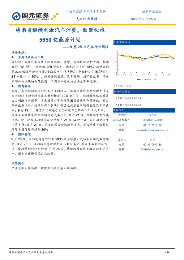 【国元证券】【20220925】汽车行业周报:海南省继续刺激汽车消费,欧盟拟推5650亿能源计划-15页
