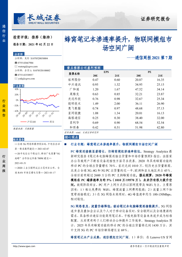 【长城证券】【20210222】20210222-长城证券-通信周报2021第7期:蜂窝笔记本渗透率提升,物联网模组市场空间广阔-14页