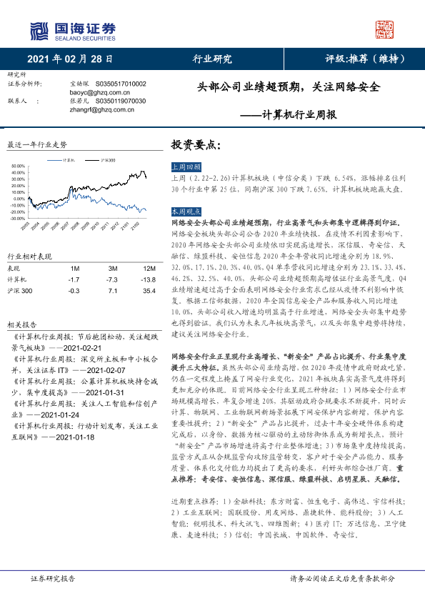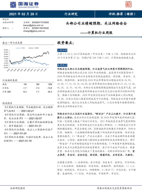 【国海证券】【20210228】计算机行业周报:头部公司业绩超预期,关注网络安全-15页