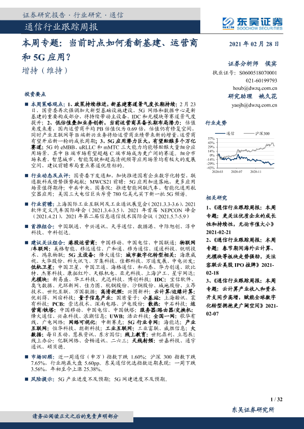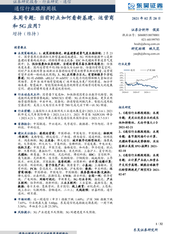 【东吴证券】【20210228】20210228-东吴证券-通信行业跟踪周报-本周专题:当前时点如何看新基建、运营商和5G应用?-32页