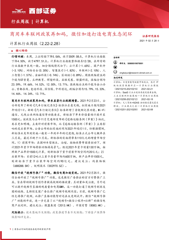 【西部证券】【20210228】计算机行业周报:商用车车联网政策再加码,微信加速打造电商生态闭环-16页