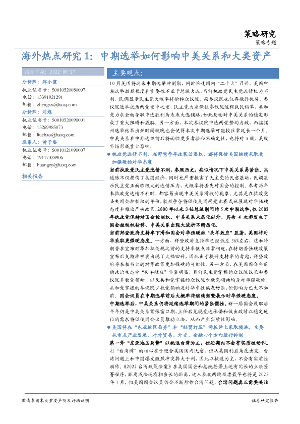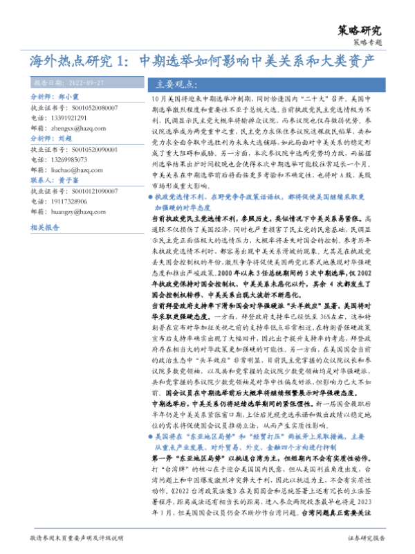 【华安证券】【20220927】海外热点研究1:中期选举如何影响中美关系和大类资产-26页