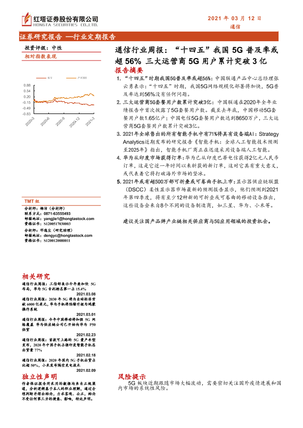 【红塔证券】【20210312】通信行业周报:“十四五”我国5G普及率或超56%三大运营商5G用户累计突破3亿-13页