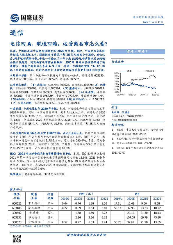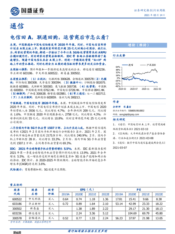 【国盛证券】【20210314】通信行业周报:电信回A,联通回购,运营商后市怎么看?-13页