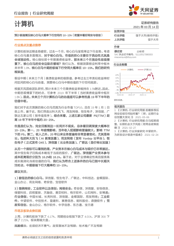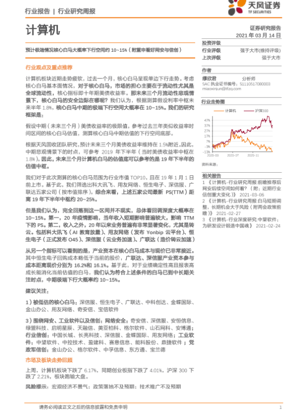 【天风证券】【20210314】20210314-天风证券-计算机行业研究周报:预计极端情况核心白马大概率下行空间约10~15%(附重申看好网安与信创)-9页