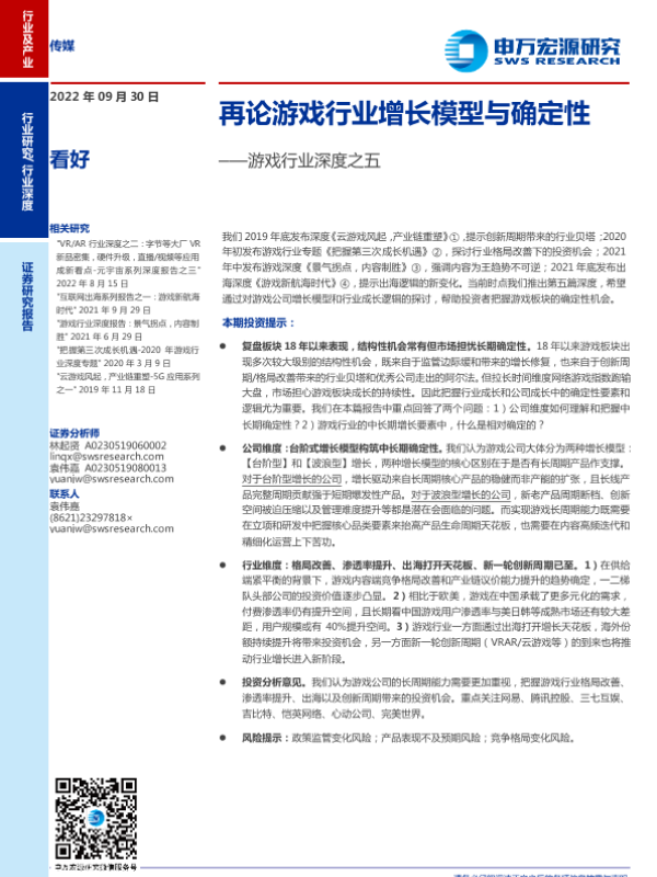 【申万宏源】【20220930】游戏行业深度之五:再论游戏行业增长模型与确定性-31页