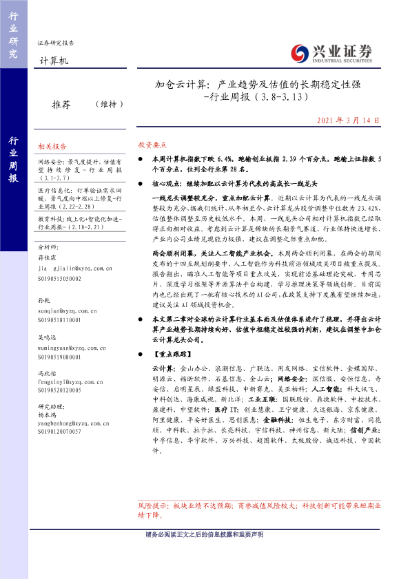 【兴业证券】【20210314】加仓云计算:产业趋势及估值的长期稳定性强 -行业周报(3.8-3.13)-29页