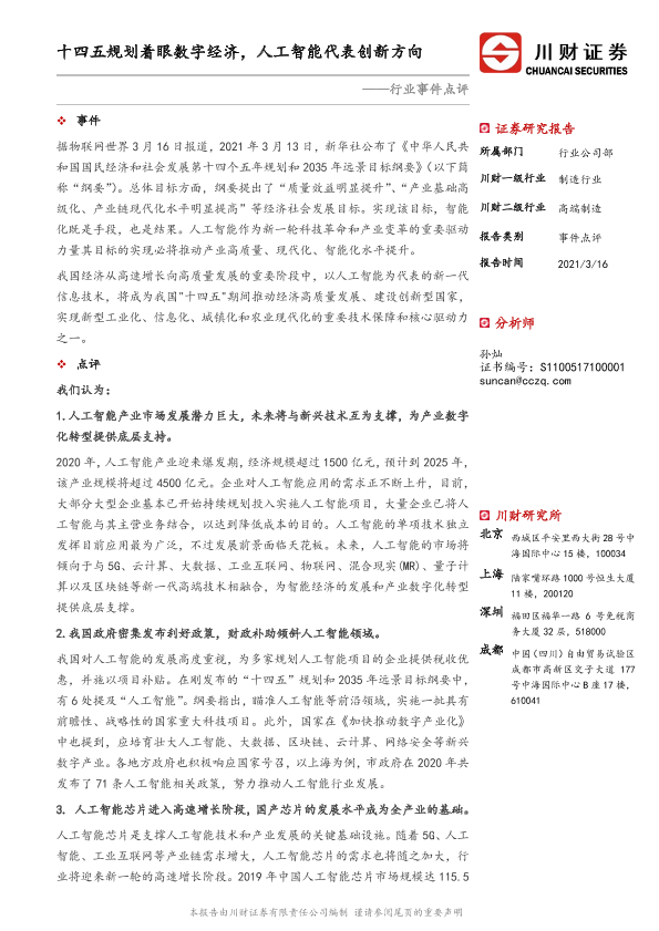 【川财证券】【20210316】制造行业事件点评:十四五规划着眼数字经济,人工智能代表创新方向-3页