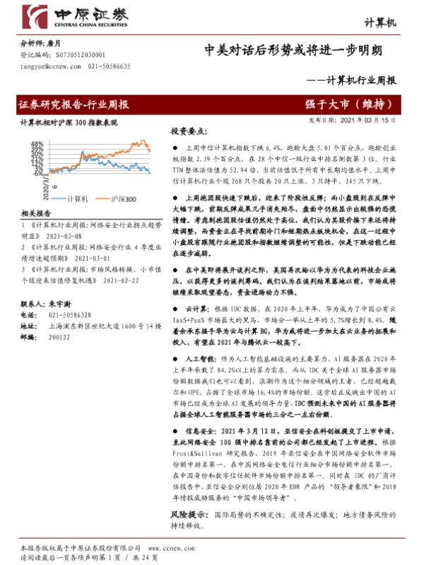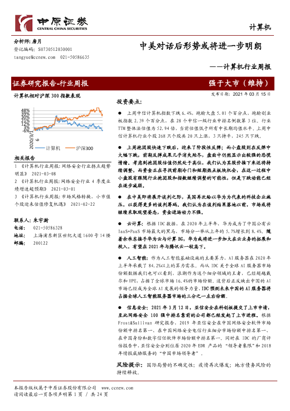 【中原证券】【20210315】计算机行业周报:中美对话后形势或将进一步明朗-24页