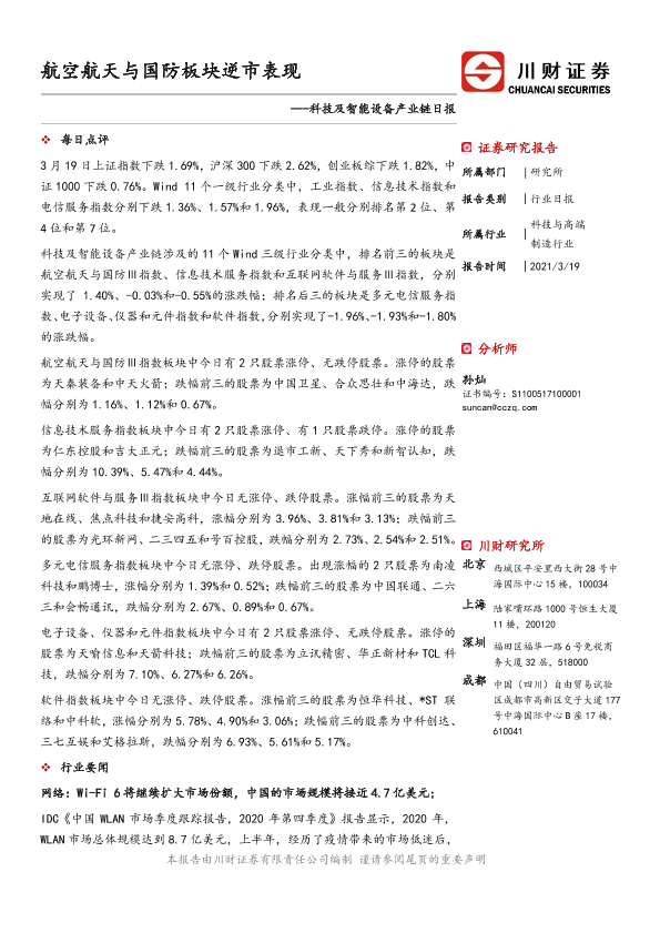 【川财证券】【20210319】科技及智能设备产业链日报:航空航天与国防板块逆市表现-3页