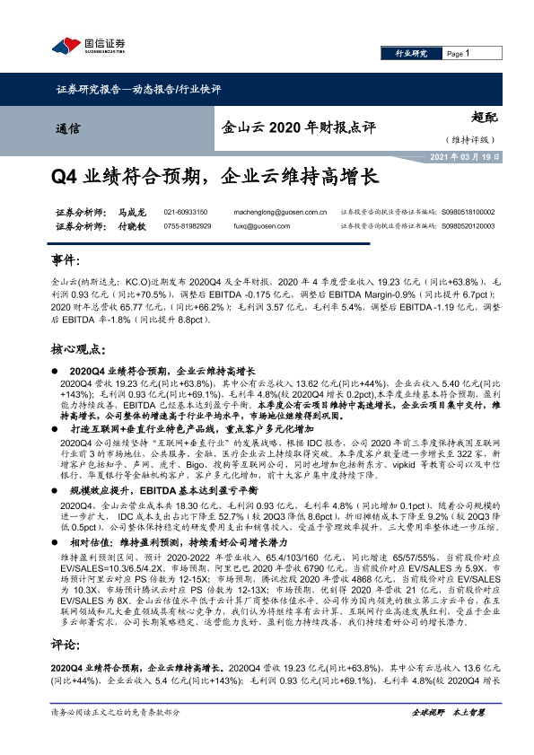 【国信证券】【20210319】通信行业:金山云2020年财报点评:Q4业绩符合预期,企业云维持高增长-8页
