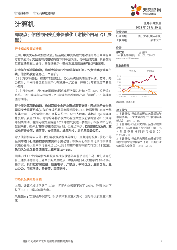 【天风证券】【20210320】计算机行业周观点:信创与网安迎来新催化(附核心白马Q1展望)-8页