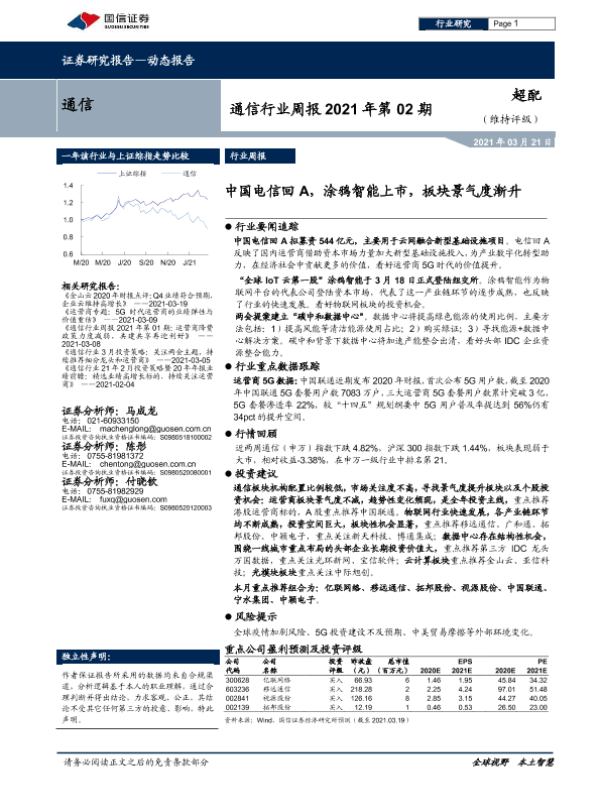 【国信证券】【20210321】通信行业周报2021年第02期:中国电信回A,涂鸦智能上市,板块景气度渐升-12页