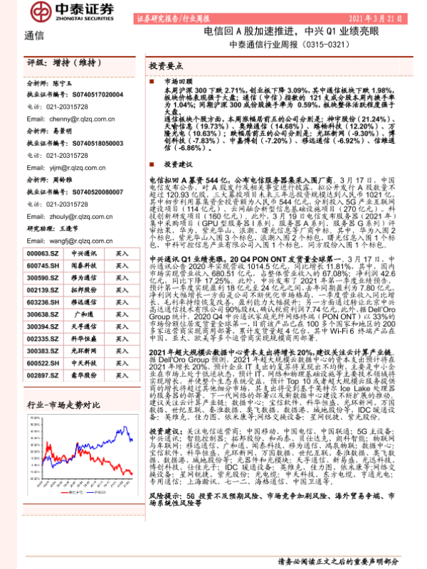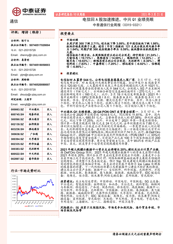【中泰证券】【20210321】中泰通信行业周报:电信回A股加速推进,中兴Q1业绩亮眼-16页
